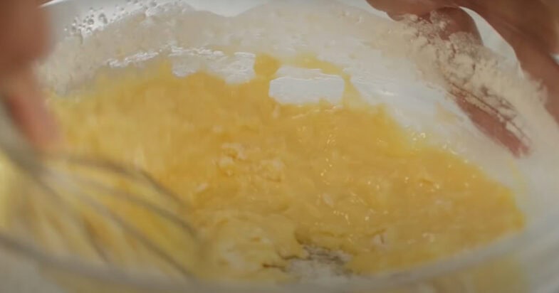 Змішую яйце з цукром. Додаю сметану, перемішую. З’єдную борошно з розпушувачем і содою, додаю до яєць зі сметаною. Перемішую до однорідності.