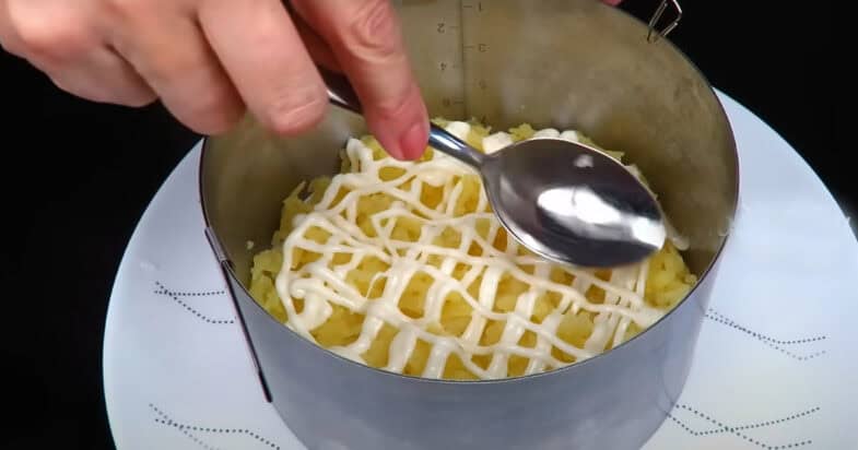 Формую салат в кільці діаметром 16 см. Першим шаром йде терта відварена картопля. Роблю сіточку з майонезу, трохи притискаю.