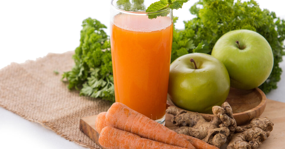 Моркву беріть велику та солодку, соковиту. Її треба почистити, а також яблука, імбир. Пропустіть все разом через соковитискач.