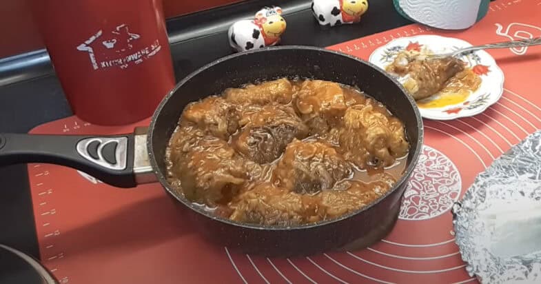 У сковорідку до смаженої цибулі вливаю соус, перемішую. Вкладаю рибу, доводжу до кипіння. Накриваю кришкою і тушкую ще 30 хвилин.