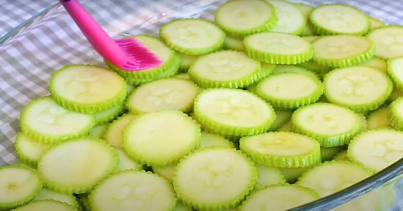 Кабачки нарізаю кружечками. Форму для запікання змащую олією, викладаю кабачки і кожен шар також змащую олією. Відправляю у духовку при температурі 200 градусів на 25 хвилин.