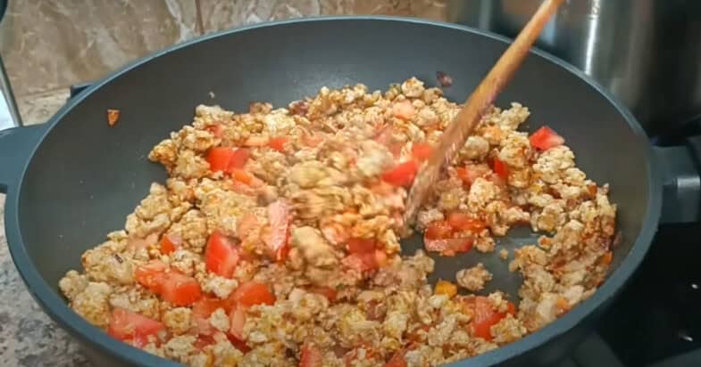 На глибокій сковорідці розігріваю олію та обсмажую до прозорості дрібно порізану цибулю. Додаю моркву терту на терці, обсмажую все декілька хвилин. Тоді додаю фарш, перемішую, обсмажую до готовності без кришки. Всипаю сіль, перець, паприку, хмелі-сунелі, перемішую. Тоді додаю помідори порізані дрібними кубиками, накриваю кришкою, тушкую 8 хвилин.