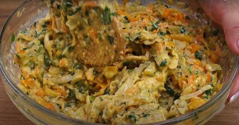Перекладаю засмажку у миску, додаю дрібно порізану зелену цибулю та петрушку. Вівсяні пластівці перетворюю у дрібну крихту у блендері, додаю до маси. Також додаю йогурт чи сметану, тертий на терці твердий сир, перемішую. Збиваю яйця з дрібкою солі, додаю до маси, перемішую.