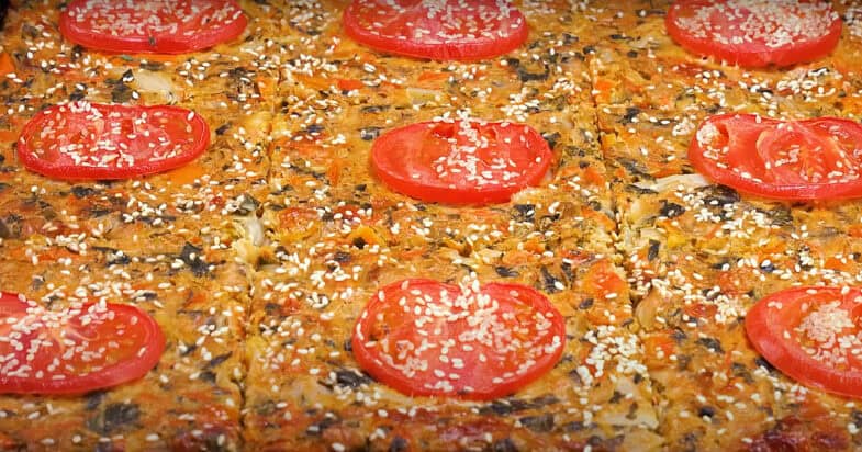 Змащую стандартне деко від духовки олією, викладаю усю масу, розрівнюю. Зверху кладу кружечки помідорів, посипаю кунжутом. Відправляю у духовку при температурі 180 градусів на 25 хвилин. Хай смакує!