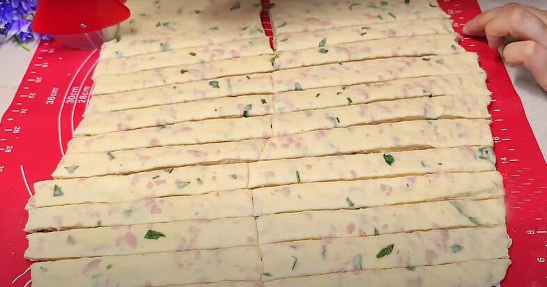 Збиваю яйця і змішую з кефіром. Додаю сіль, цукор, подрібнену петрушку, тертий на терці твердий сир та ковбасу, перемішую. Всипаю борошно та розпушувач, замішую тісто руками. Накриваю пакетом та залишаю на 10 хвилин відпочити. Розкачую на столі, нарізаю смужками.