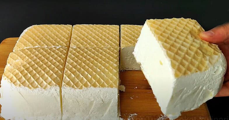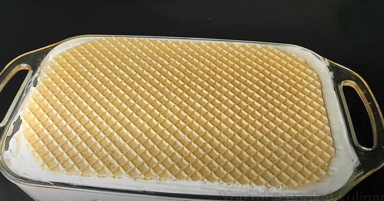 Викладаю у форму на дно вафельний корж. На корж розподіляю крем. Кладу другий корж і відправляю в морозильну камеру на 8-12 годин.