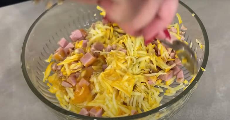 Кабачок натираю на терці, додаю яйця, шинку нарізаю кубиками, солю та перчу, всипаю суміші італійських трав, перемішую. Всипаю борошно та розпушувач, перемішую. Сир натираю на терці, перемішую.