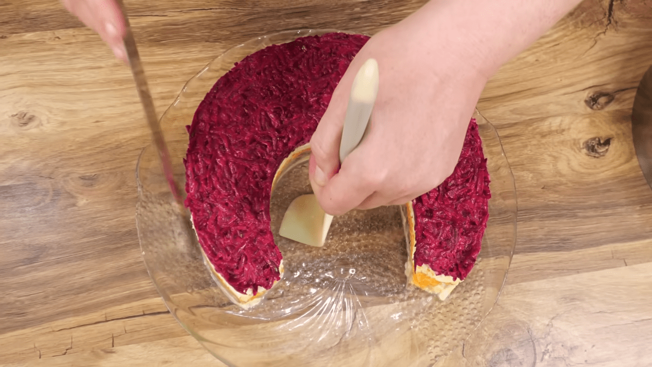 Для формування салату встановлюємо кулінарні кільця на блюдо так, щоб утворилася форма підкови. Першим викладаємо шар картоплі, далі – оселедець із цибулею, потім моркву. Між овочевими шарами натираємо яйця на дрібній тертці, злегка підсолюємо й змащуємо майонезом. Завершуємо шаром буряка.