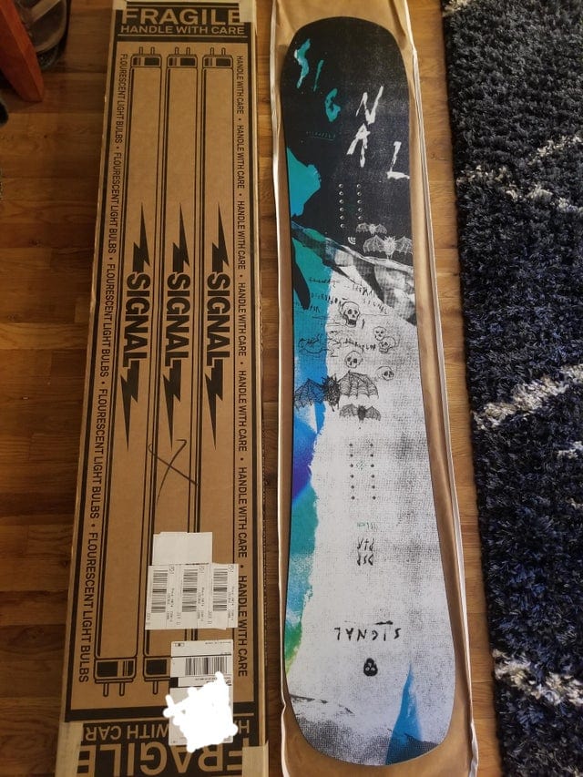Мій сноуборд доставили у коробці із зображенням ламп, щоб його не зламали під час транспортування.