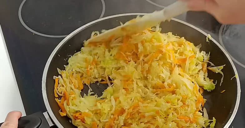 Капусту шаткую. Моркву тру на велику терку, а цибульку люблю різати соломкою. Тепер усі овочі об’єдную, легенько «жмакаю», щоб вони зменшились в об’ємі. На сковорідку ллю олію – іноді беру сальце або шматочок м’яса для смаку, якщо є. І смажу всі овочі разом. Капуста на сковорідці м’якне, стає прозорою – я цукру. Це моя хитрість: капуста одразу отримує глибший смак і легеньку карамельність. Потім сіль та перець – усе на смак, обов’язково пробую під час готування.