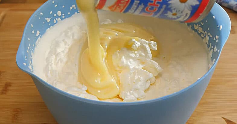 Додаю згущене молоко та збиваю міксером до однорідності.