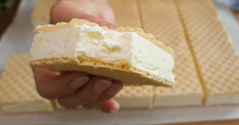 Беру квадратну роз’ємну форму для випікання, застеляю пергаментом чи харчовою плівкою. Кладу на дном вафельний лист. Виливаю в неї морозиво, рівномірно розподіляю його та накриваю другим вафельним листом. Злегка притискаю, щоб морозиво рівномірно розподілилося. Ставлю в морозилку на кілька годин або на ніч. Нарізаю на потрібні шматочки та смакую!