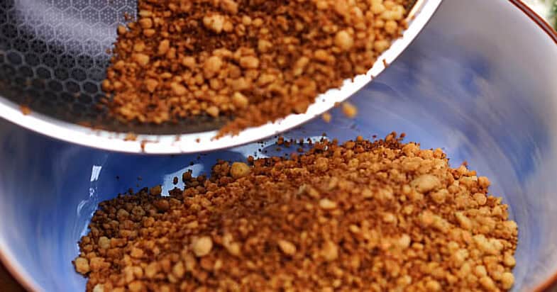 Змішую борошно, сіль та цукор, додаю порізане шматочками холодне масло і перетираю усе разом у крихту. Смажу на сухій сковорідці, постійно помішуючи, до золотистості крихти.