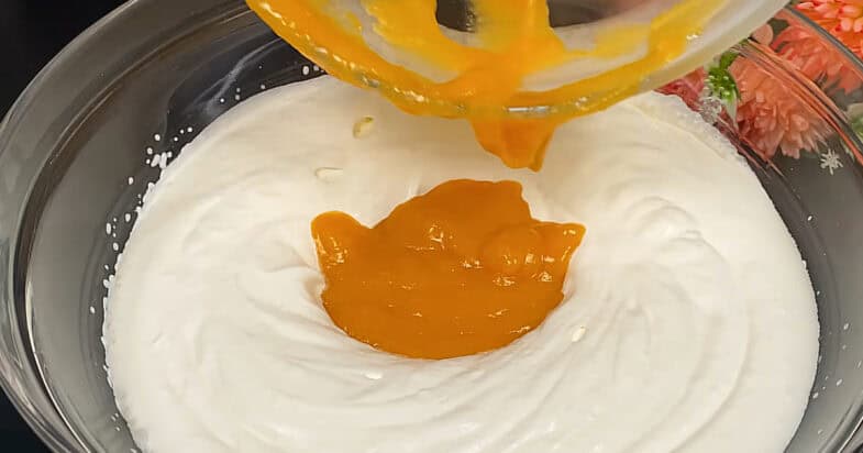 Збиваю у мисці міксером вершки до пишності. Додаю перемелені персики і змішую вже лопаткою до однорідності.