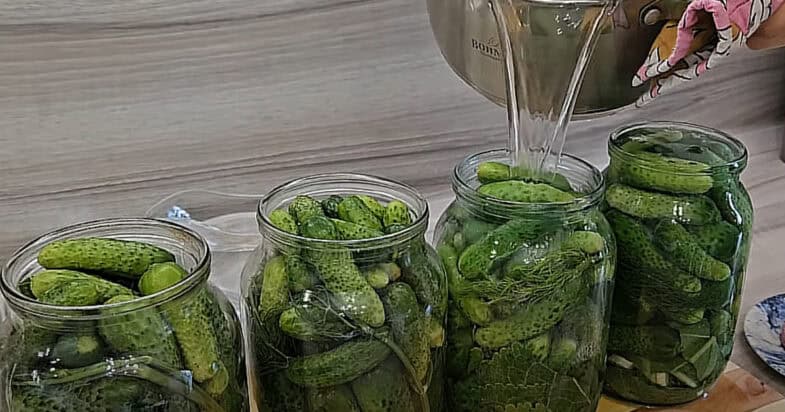 Огірки замочую на 2 години в холодній воді. Часник нарізаю пластинами. Листя та корінь хрону нарізаю шматочками. В чисту банку на дно викладаю: кріп, хрін, часник, лавровий лист, чорний перець, духмяний перець, листя вишні і пекучий перець. Після чого закладаю огірки. Заливаю окропом до самого верху банки та накриваю кришкою. Залишаю на 15 хвилин.